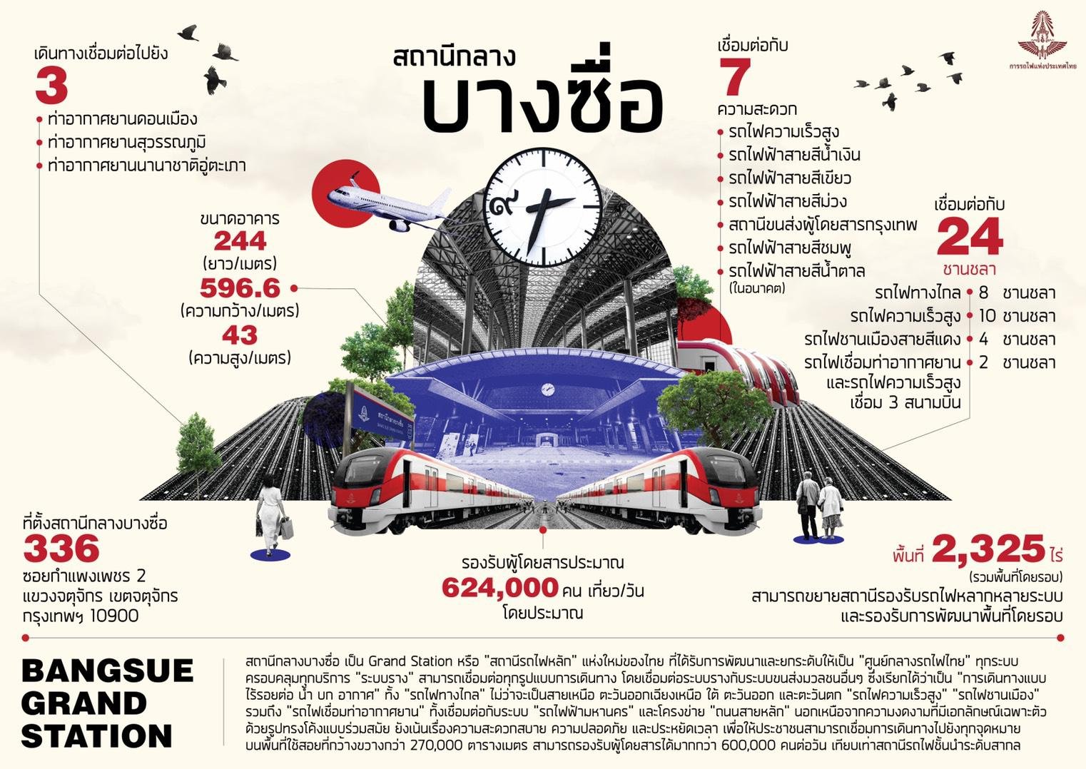 การรถไฟแห่งประเทศไทย เปิดรายละเอียดให้รู้จักสถานีกลางบางซื่อทุกซอกมุม เริ่มจากความงดงามที่ของสถาปัตยกรรมการก่อสร้างมีเอกลักษณ์เฉพาะตัว ด้วยรูปทรงโค้งแบบร่วมสมัย ยังเน้นเรื่องความสะดวกสบาย ความปลอดภัย และประหยัดเวลา เพื่อให้ประชาชนสามารถเชื่อมการเดินทางไปยังทุกจุดหมาย บนพื้นที่ใช้สอยที่กว้างขวางกว่า 298,200 ตารางเมตร โดยสามารถรองรับผู้โดยสารมากถึง 624,000 คน/วัน เทียบเท่าสถานีรถไฟชั้นนำระดับสากล